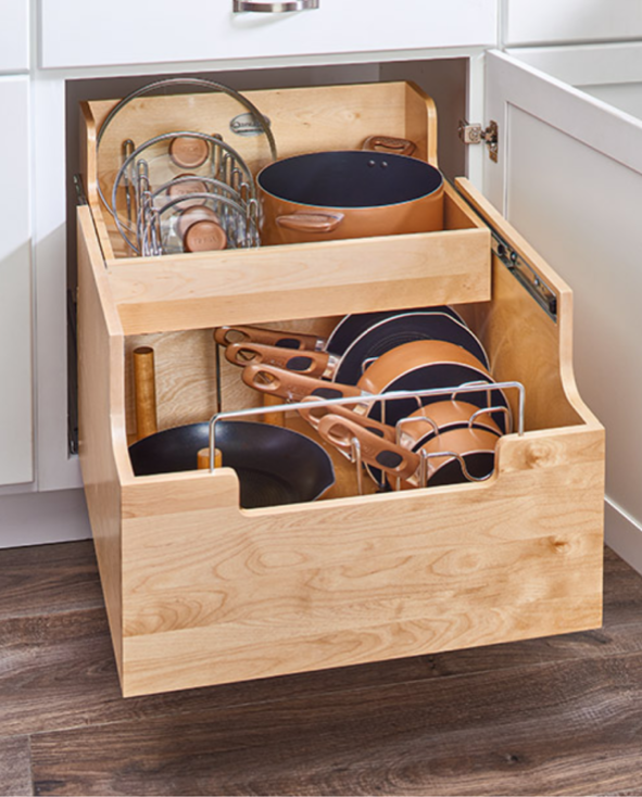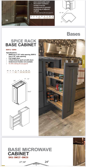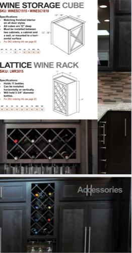 - Specialty items such as: Spice Drawers, Wine Racks, Plate Racks, Garbage Pull Outs, Stacker cabinets, Split legs, Corbels, Standard Crown and Cove moldings, just to name a few.