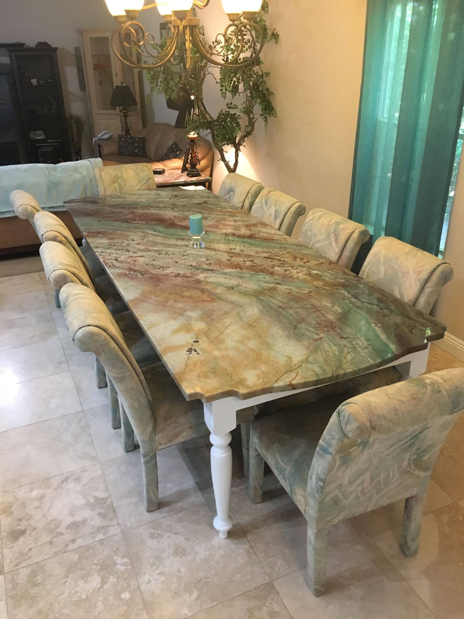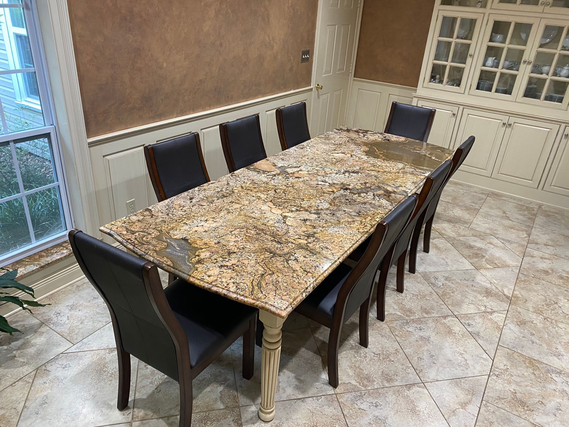 By the way, if you’re looking for something unique, how about our custom-built dining room tables with stone to match or complement your countertops. They can even be customized to fit your space. Or, how about full showers for your bathrooms. Have you thought about stone for your windowsills, thresholds or shower caps? We can even do stair treads. There is also the option to do full splash; imagine it going all the way to the ceiling.